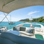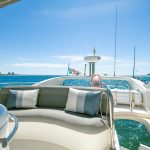 Plusieurs espaces de détente sont aménagés : sur le flybridge, le pont avant, à l’arrière (avec table) et dans le salon intérieur.
